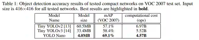 YOLO Nano 比 Tiny YOLOv2 和 Tiny YOLOv3更小,更快,mAP更高!模型仅4.0MB。在 NVIDIA Jetson Xavier上速度竟高达26.9~48.2 FPS!