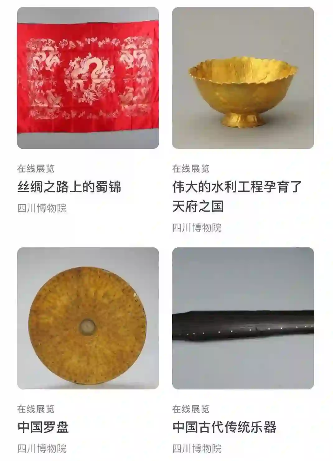 通过 Google Arts & Culture 搜索「四川博物院」,搜索结果下用户能欣赏到包括「丝绸之路上的蜀锦」、「中国罗盘」在内的六个展览作品故事,需要借助 Google Cardboard 的 VR 体验,数百张收藏品照片,一幅 360 度博物馆全景图像。
