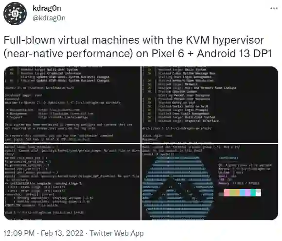 Android 和 Web 开发人员 @kdrag0n 发现了隐藏在 Android 13 预览版中的闪光点:谷歌 Pixel 6 等设备在安装 Android 13 预览版后,可实现完全虚拟化!
