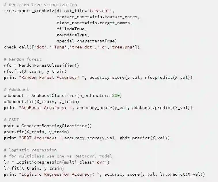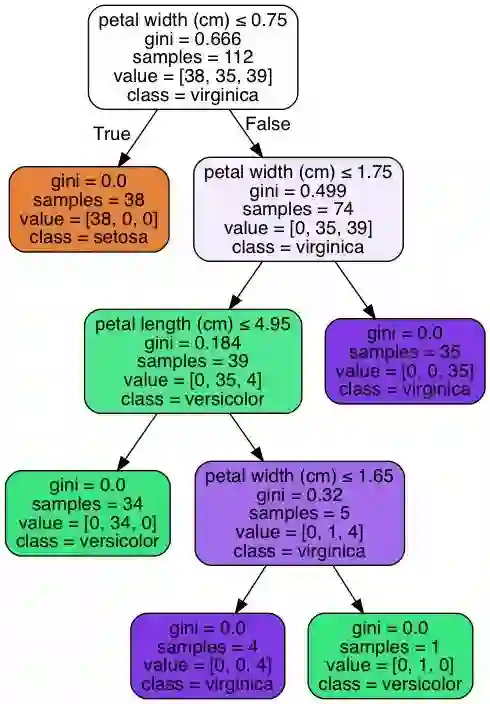 使用 sklearn 用决策树来进行莺尾花数据集的划分问题。代码上没有固定随机种子,所以每次运行的结果会稍有不同。