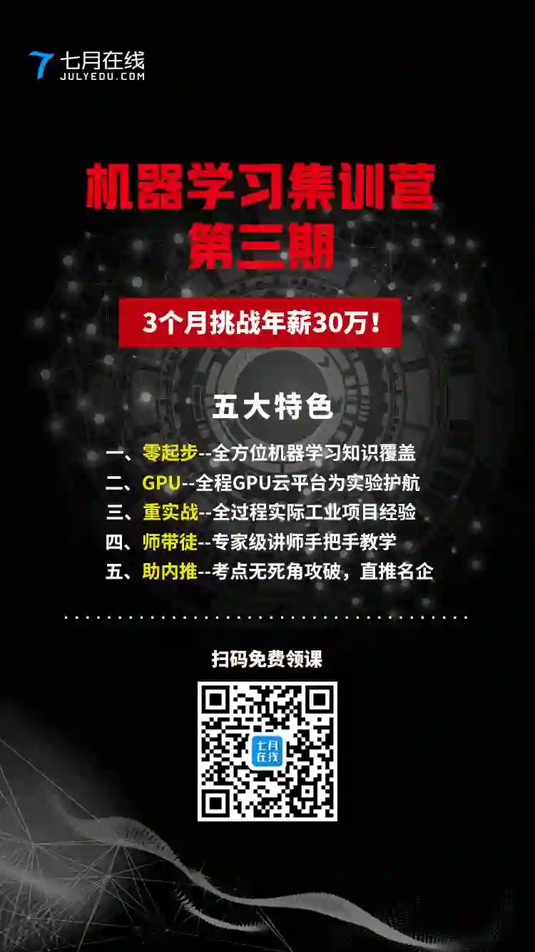 为帮助对人工智能感兴趣的同学,以及想转行到人工智能领域的在职人士。七月在线特别推出《机器学习集训营(三期)》,课程将以线上+线下(北京、上海两个实战基地)形式,引入BAT专家面对面、手把手教学方式;突出BAT级工业项目实战辅导,一步一步为你演示各个案例的实际操作,即使没有任何基础的同学也可以轻松上手。此外,还提供精讲面试考点,一对一面试求职辅导,从入门到高薪,轻松达成!