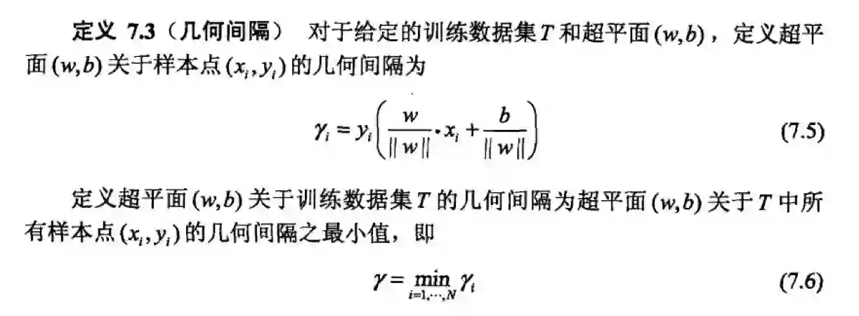 所以我们想到了对超平面的法向量 W 施加一些约束,比如规范化,使得间隔确定,这就引出了几何间隔: