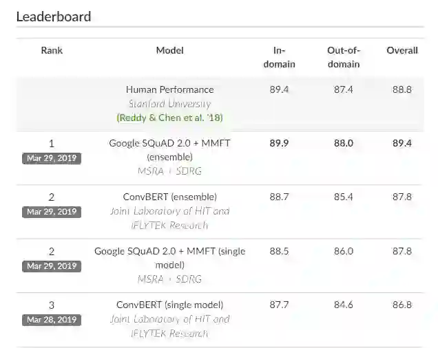 在CoQA排行榜上,微软研究人员于2019年3月29日提交的集合系统的域内、域外和整体F1得分分别达到了89.9 / 88.0 / 89.4。同一会话问答下的人类表现为89.4 / 87.4 / 88.8。