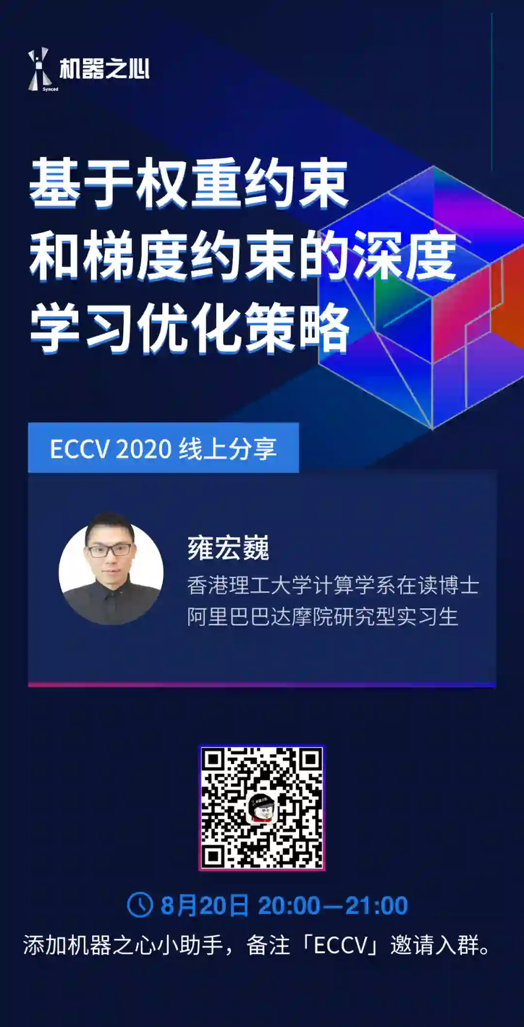 8月20日,机器之心 ECCV 2020 线上分享的第二期,我们邀请到香港理工大学 (HK PolyU) 计算学系在读博士、阿里巴巴达摩院视觉计算组研究型实习生雍宏巍为我们分享 Oral 论文《Gradient Centralization: A New Optimization Technique for Deep Neural Networks》。