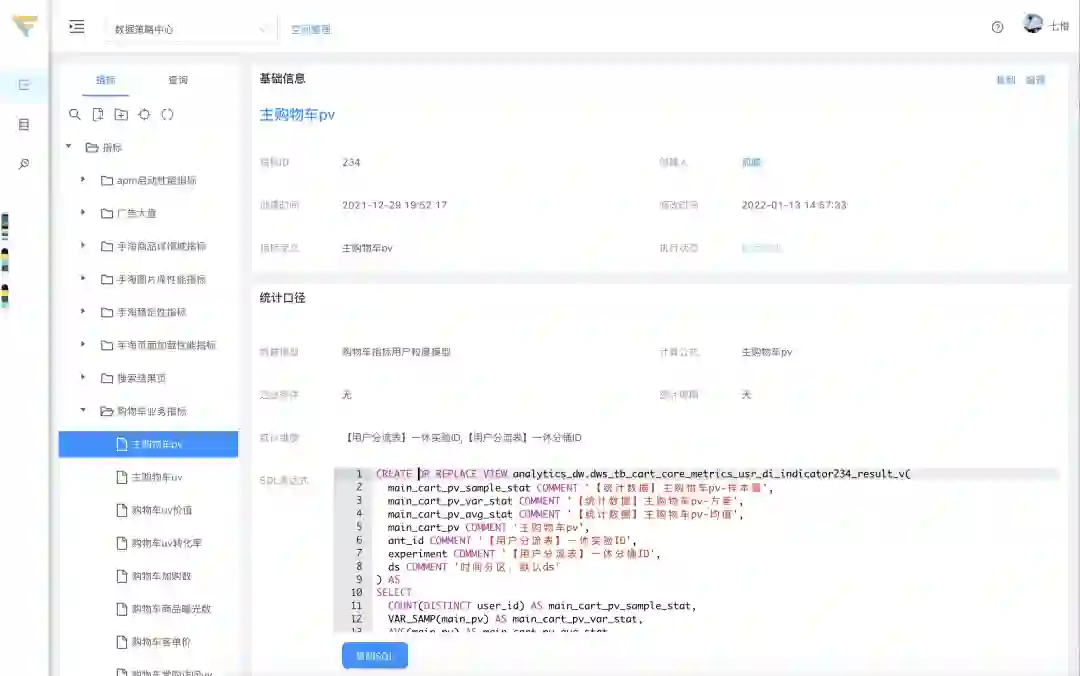 除了Sql表达式直观明了外,还能在元数据管理中查看每个配置的含义(当然目前交互联动还做的不够好,人不够呀)。因为指标是通过各配置直接生成的,所以也可以保证口径与数据是强一致的。
