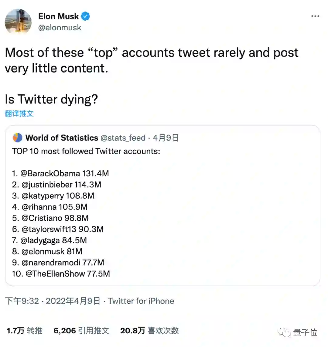 4月9日,马斯克公开发问“推特粉丝最多的十个账户中大部分都已经不活跃了, 推特这是要凉凉了吗?”