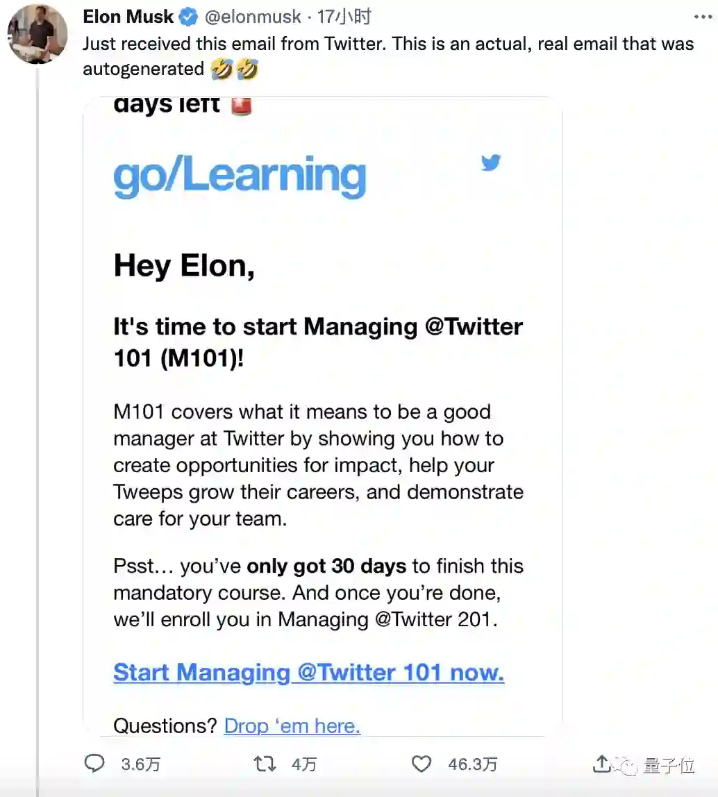 有趣的是,就在他一顿忙活之时,收到了一封自动分发给新任推特高管的邮件,要求他30天内必须修完推特管理101课程,学会如何当好一名管理者……