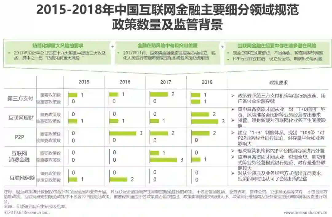自2017年,互联网金融各细分领域规范政策密集出台,对行业产生重大影响的政策数显著高于此前两年。