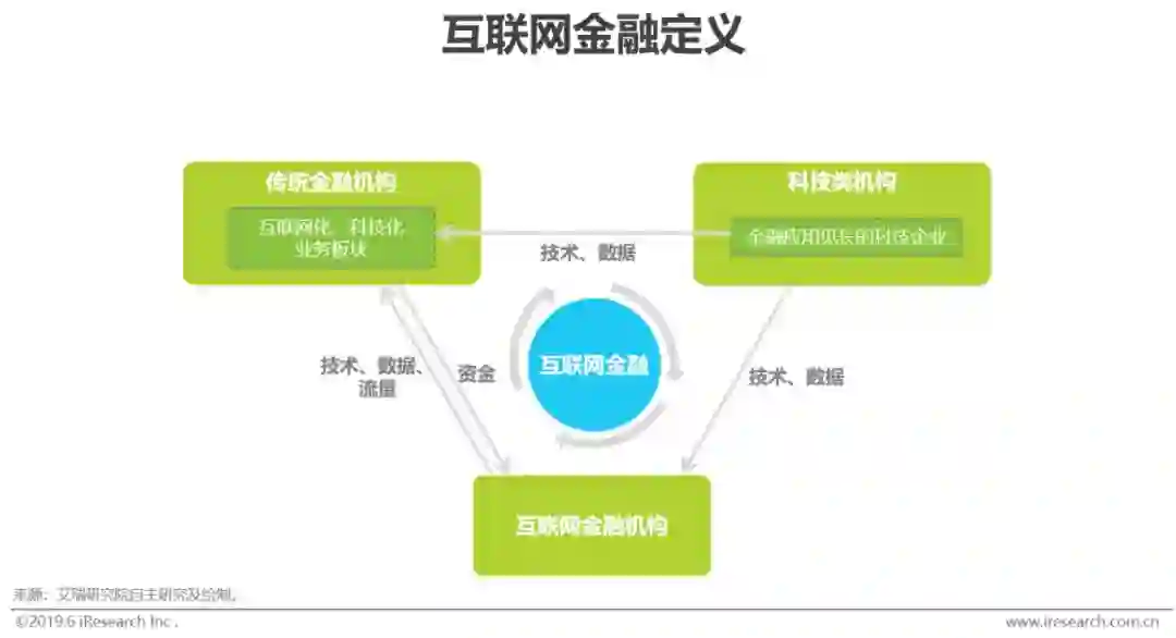 广义的互联网金融包含三类参与机构:第一,传统金融机构的互联网化、科技化业务板块;第二,互联网巨头的金融业务板块或主业为互联网金融的机构,例如蚂蚁金服、腾讯FiT、乐信、宜人贷;第三,金融行业客户占比高的科技企业,如百融云创、第四范式等。此外值得一提的是,这三类机构的边界正在变得越来越模糊,例如蚂蚁金服转型为向传统金融机构输出科技服务的科技类机构,再如银行通过开放银行向其他金融机构输出科技服务,等等。