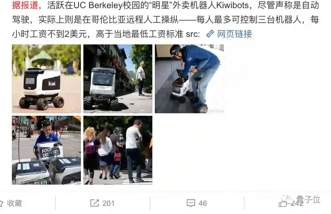 “尽管声称是自动驾驶,实际上则是在哥伦比亚远程人工操纵——每人最多可控制三台机器人,每小时工资不到2美元,高于当地最低工资标准”。