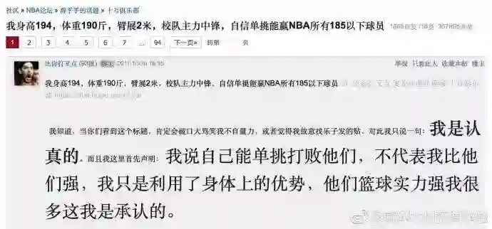 这是虎扑一个史诗级别的神贴,标题叫《我单挑能赢NBA所有185cm以下的球员》,作者 ID是 “比你打又点”,人称“比哥”的虎扑用户。