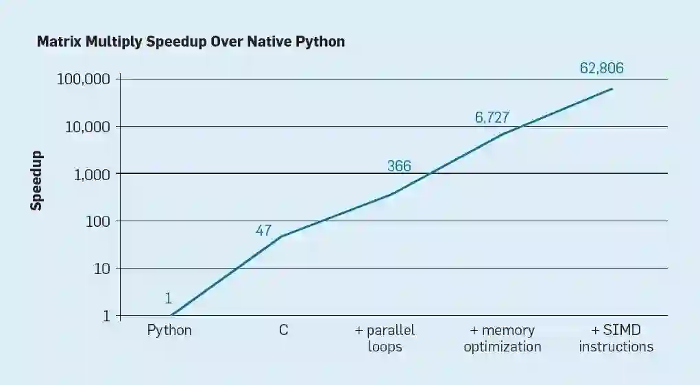 首先,目前软件普遍由具有动态类型和存储管理的高级语言编写,它们的可解释性和执行效率十分低下。例如用 C 语言重写 Python 代码,就可以将矩阵相乘运算的性能提升 47 倍,如果再引入并行循环处理,内存优化以及单指令多数据并行化操作,那么运算执行速度可达 Python 版本的 62000 多倍。这说明,高级语言与传统语言存在巨大差距,前者注重程序员的编程效率,后者更注重程序性能。