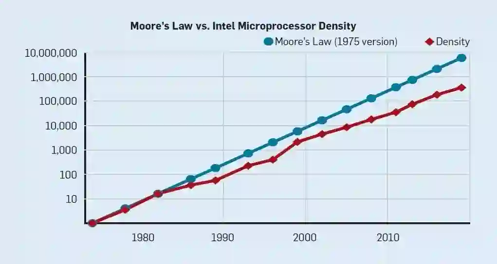 自 20 世纪 70 年代末以来,主流技术一直是基于金属氧化物半导体(MOS)的集成电路,包括 n 型金属氧化物半导体 (nMOS) 和互补金属氧化物半导体 (CMOS)。MOS 技术的惊人进步速度,提升了晶体管密度,让架构师能够更好地为特定指令集提升性能。这种规律被摩尔所捕捉,他的摩尔定律预测:晶体管密度将会每两年翻一倍。