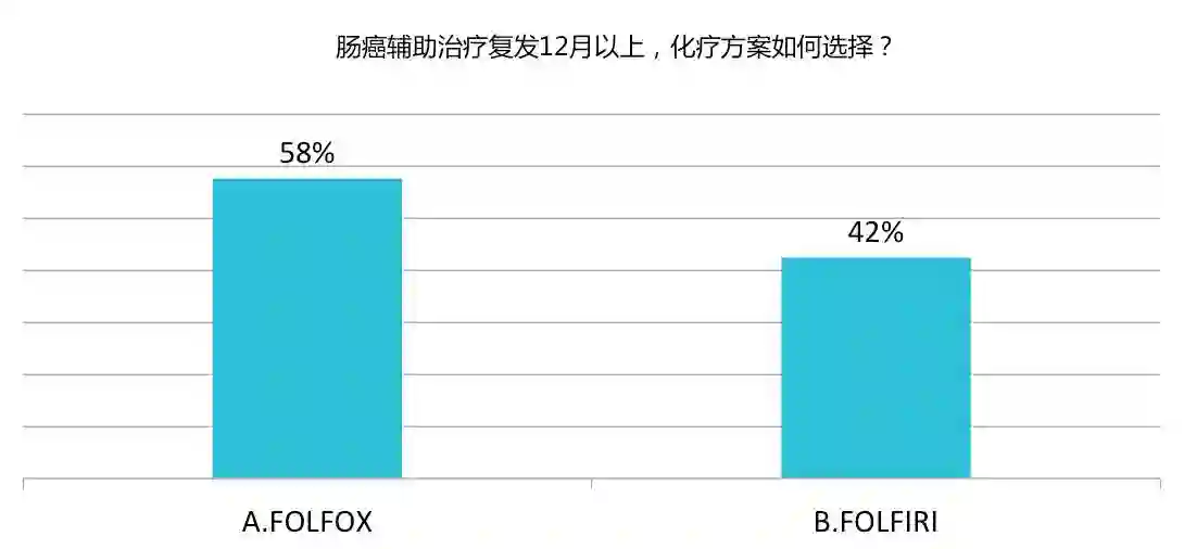 CALGB/SWOG 80405 研究显示,对于 KRAS 野生型转移性结直肠癌(mCRC),一线 FOLFOX 或 FOLFIRI 方案联合贝伐珠单抗(Bev)或西妥昔单抗(Cet)在 OS 和 PFS 方面均无显著差异。后续的回顾性分析发现,右半结肠肿瘤患者一线接受 BEV 治疗相比 Cet 显示出更好的生存获益(24.2月与16.7月),这主要与左右半结肠的胚胎起源不同导致二者的分子生物学特征上差异有关。其他如FIRE-3等研究均证实了Bev在右半结肠获益显著高于Cet。而V308试验则比较了一线FOLFOX序贯二线FOLFIRI与一线FOLFIRI序贯二线FOLFOX的疗效差别,两组的一线治疗缓解率(RR,54% vs 56%)、中位总生存期(mOS,20.6月 vs 21.5月)均无统计学意义的差异,而二线的RR(4% vs 15%)与mPFS(2.5月vs4.2月)则以后者为高。因此从二线治疗的疗效考虑,以先用FOLFIRI序贯FOLFOX为佳。综上所述,该患者的一线治疗方案为FOLFIRI+Bev是最佳的选择。