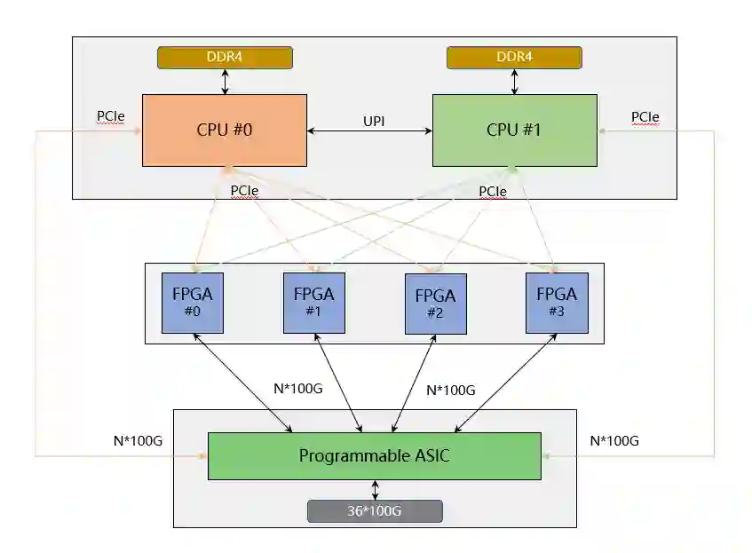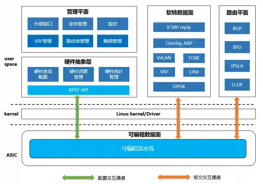 可编程网关平台 3.0 将可编程 ASIC、FPGA、高性能 CPU 一体化,并且通过模块化的硬件设计,实现针对不同场景的灵活定制,满足全业务场景的高性能可编程诉求。在一些业务规格要求不高的场景,可以通过低配 CPU+ 可编程 ASIC 退化为类似 2.0 的方式应用,尽可能减少成本,提高资源利用率。在一些业务规格要求较高的场景,可以通过 FPGA 扩展的方式实现大规格表项,满足业务大规格诉求。在一些特殊应用场景中,还可以将高性能 CPU 作为数据面慢路径,可编程 ASIC 作为快路径,通过软硬协同方式满足特殊场景需求。