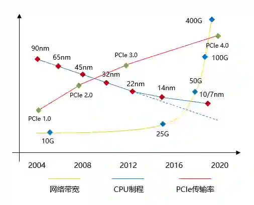 图 2 网络带宽与服务器硬件演变趋势