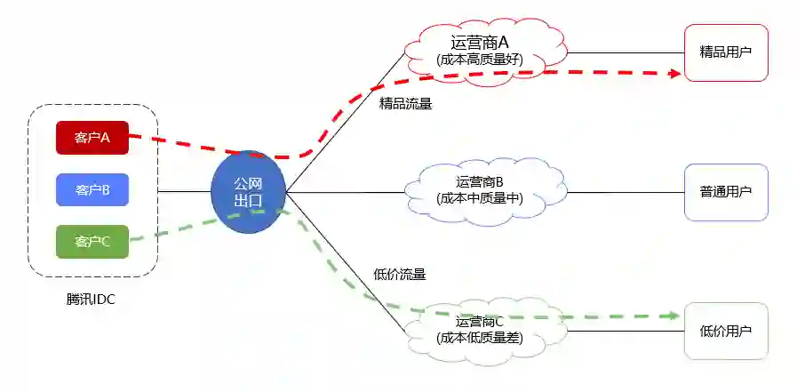 云上客户存在一个普遍诉求就是通过云上资源触达用户,运营商公网接入主要承载此类业务。早期腾讯运营商公网接入主要依赖商业设备来实现,但传统网络解决方案主要基于路由相关策略进行业务支持,无法精细化感知业务细节。通过可编程网关平台可以基于业务应用进行差异化调度,提升公网服务能力。以精品网业务为例,云上众多客户对网络质量要求各不相同,有些要求时延低,有的要求带宽高,有些要求成本低。而公网资源十分宝贵,如果对每个客户都采用相同的策略提供公网服务,将无法满足客户个性化需求,也无法收回成本。将质量敏感成本不敏感的业务走质量较好的链路,成本敏感但质量容忍度高的业务走带宽较大的链路,通过这种方式将网络流量分而治之,为不同客户提供差异化服务。