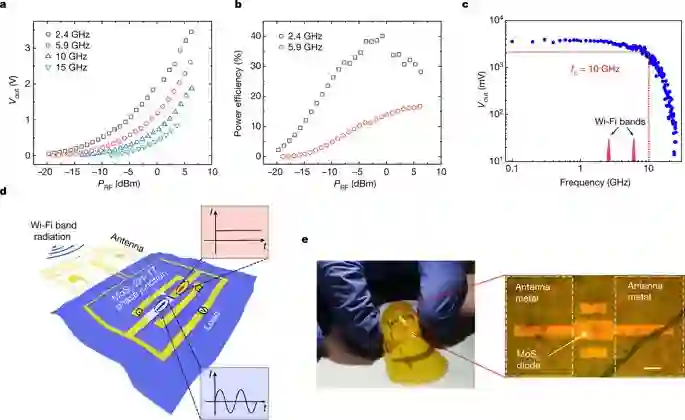 研究人员所报告的工作,为将WiFi转化为电力的其他柔性设备提供了蓝图,这些柔性设备具备足够大的输出和效率。根据WiFi输入信号的输入功率,目前设备的最大输出效率约为40%。在典型的WiFi功率等级下,MoS2 整流器的能量效率约为30%。相比而言,目前最佳的硅和砷化镓整流天线(由更加昂贵的刚性材料硅和砷化镓制成)实现了差不多50%到60%的效率。