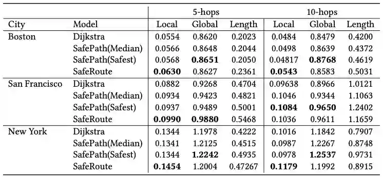 另外,我们在多种尺度上对SafeRoute进行了评估,路线的质量有三个方面:距离犯罪点的平均距离(包括局部和全局两种)以及路线长短。局部犯罪平均距离只考虑当智能体走在路上时,附近的犯罪活动。而全局的平均距离会考虑该路线上所有发生过的犯罪活动。其中局部平均距离是重点考量因素。