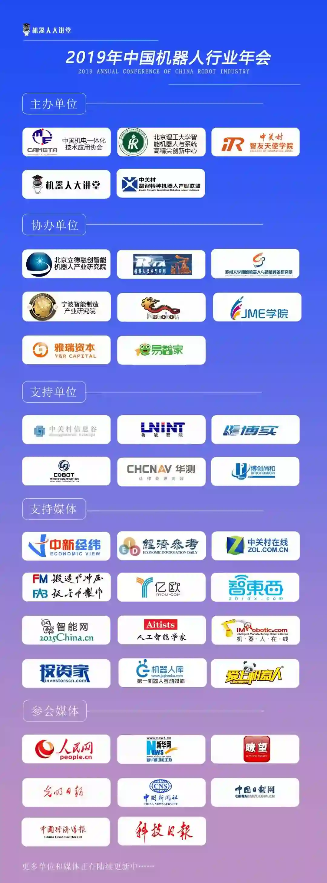 2019年中国机器人行业年会作为2019年中国机器人行业的首场盛事,在国家部委领导、行业内专家和企业家的悉心指导下,行业相关学会、协会和联盟等组织的鼎力支持中,如约而至。本届年会由中国机电一体化技术应用协会、北京理工大学智能机器人与系统高精尖创新中心、中关村智友天使学院、机器人大讲堂(立德共创服务平台)和中关村融智特种机器人产业联盟在北京联合主办,得到了中关村信息谷、山东鲁能智能、哈尔滨博实、武汉库柏特、上海华测导航技术股份有限公司等单位的大力支持,必将成为2019年初行业最瞩目的焦点。