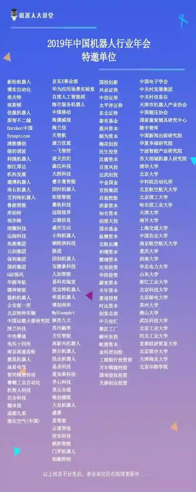 在这里,机器人大讲堂(立德共创服务平台)满怀感恩,感谢大家的一路相伴,同时愿意与大家一同携手,共同推动行业实现更快更好发展。2019年中国机器人行业年会这场年度盛宴,我们不见不散!