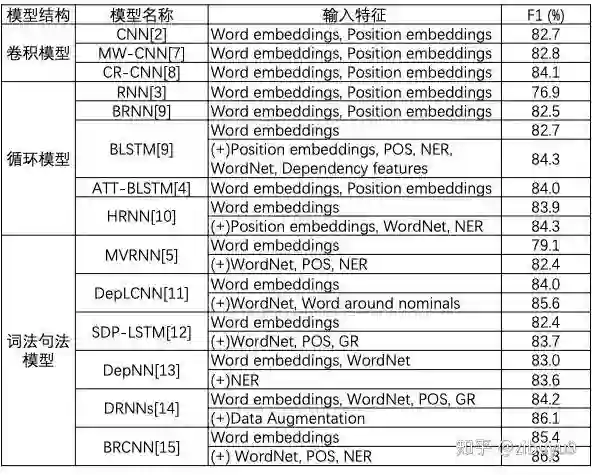 面向自然语言文本序列已经有很多神经网络类型,例如循环神经网络(RNN、LSTM)、卷积神经网络(CNN)和Transformer等,这些模型都可以通过适当改造用于关系抽取。最初,工作 [1,2] 首次提出使用CNN对句子语义进行编码,用于关系分类,比非神经网络方法比性能显著提升;工作 [3,4] 将RNN与LSTM用于关系抽取;此外,工作 [5] 提出采用递归的神经网络对句子的语法分析树建模,试图在提取语义特征的同时考虑句子的词法和句法特征,这个想法也被不少后续工作的进一步探索。这里,我们列出一个表格,总结各类典型神经网络在基准测试数据集合SemEval-2010 Task-8 [6] 上的效果。