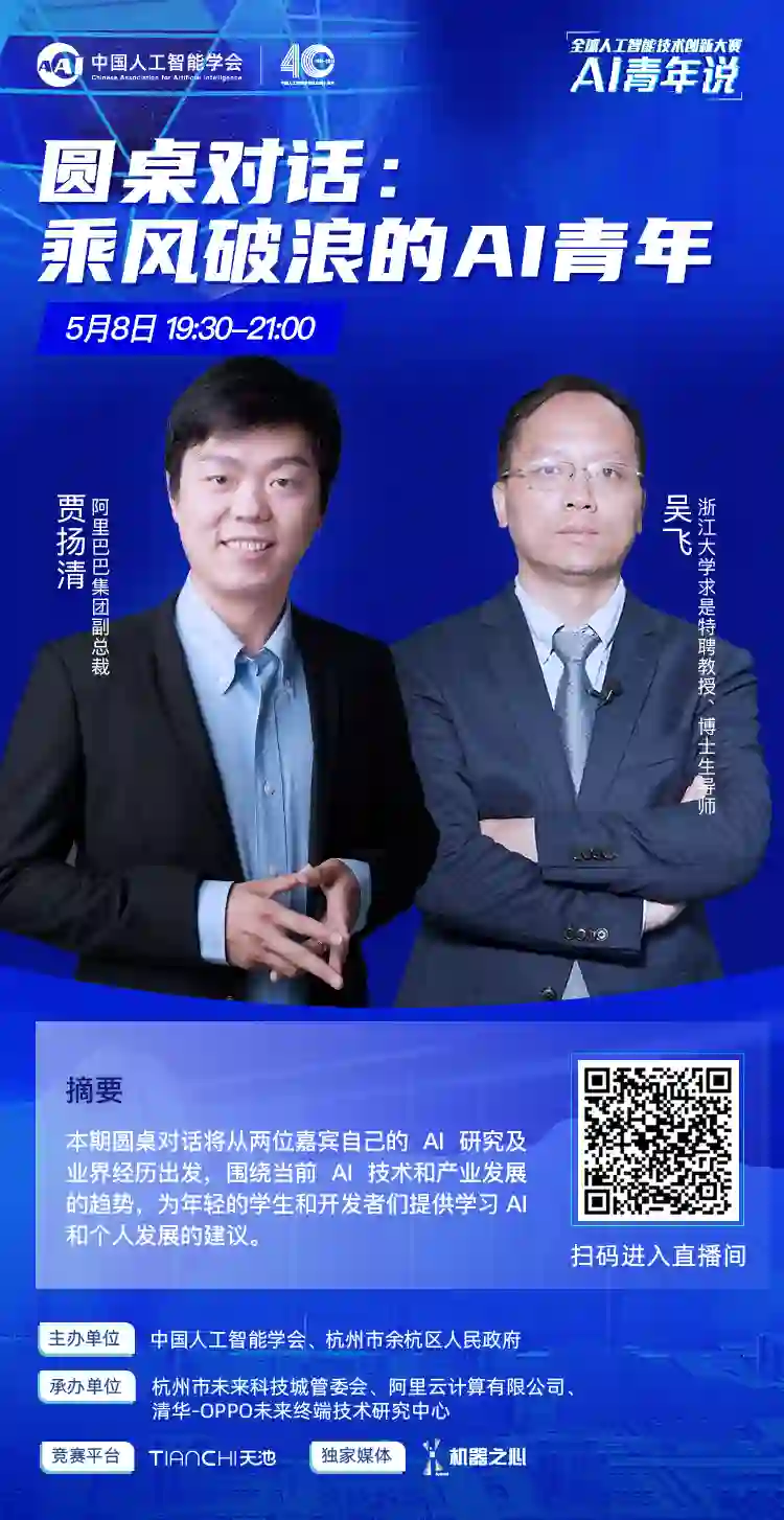 人工智能正深刻改变着人们的生产、生活和学习方式。近年来,NLP、CV 等机器学习领域出现了爆炸性的增长,在技术加速发展的推动下,AI 技术已经从实验室走向大规模的商业应用,人工智能迎来新一轮的发展热潮。AI 作为新一轮产业变革的核心驱动力,将进一步释放历次科技革命和产业变革积蓄的巨大能量,并创造新的强大引擎。 目前 AI 技术已在金融、医疗、安防等多个领域实现技术落地,应用场景也越来越丰富。人工智能的商业化在加速企业数字化、改善产业链结构、提高信息利用效率等方面起到了积极作用。随着人工智能研究和应用领域的不断延伸,未来人工智能将迎来更多技术的结合应用。 为了推动 AI 技术的应用创新,促进人工智能领域的学术交流、人才培养,打造人工智能的人才交流平台与产业生态圈,中国人工智能学会联合杭州市余杭区人民政府联合发起了首届全球人工智能技术创新大赛,并得到了阿里云、OPPO 等头部科技企业的积极参与和支持。阿里云天池平台为本次大赛提供平台和算力支撑。 AI 青年说是大赛主办方为提升青年开发者对 AI 的认识而主办的系列活动,该活动邀请知名青年学者,探讨理论研究与应用实践中的热点话题。 5 月 8 日,AI 青年说将迎来第四期直播,主题为「乘风破浪的 AI 青年」。 在本期活动中,浙江大学求是特聘教授、博士生导师吴飞老师和阿里巴巴集团副总裁贾扬清老师将面向「人工智能技术和产业发展的趋势」展开圆桌讨论。 本场圆桌将分为三大部分,首先两位嘉宾将介绍各自的 AI 之路,为观众们分享自己的 AI 经验。其次,两位老师将探讨人工智能技术和产业发展的一些大的趋势。在把握好这些趋势的情况下,两位老师也将从各自的观点出发,对各位观众朋友提供一些学习 AI 和个人发展的建议。