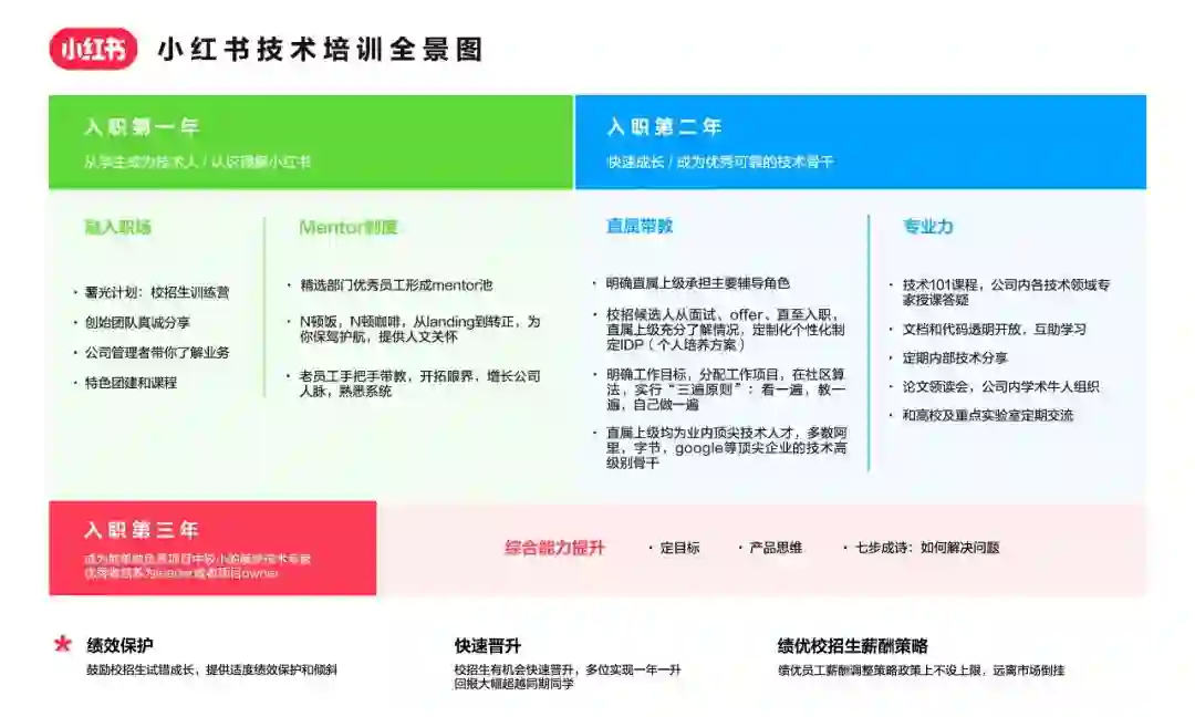特别的是,面向入职之后的优秀应届生,直属上级会始终关注新人的成长过程,提供指导与帮助,也会分享来自国内外大厂的技术经验给到同学们。此外,小红书技术团队还面向应届生提供了绩效保护和绿色晋升通道,以往已经有多位技术应届生获得了连续晋升。