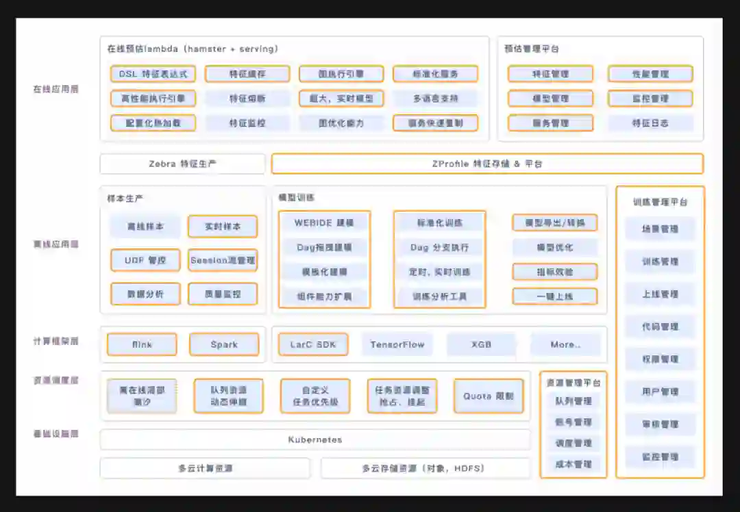 目前,LarC 机器学习平台的能力已经相当完整,涵盖从底层基础设施到计算框架、资源调度、离线应用以及在线部署多个层面(其中标黄部分代表已经实现)。