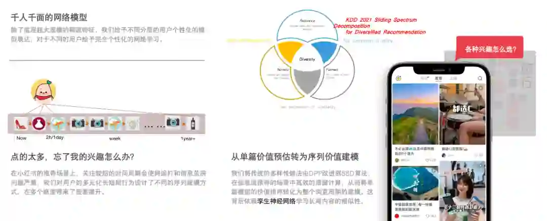在推荐场景中,关注较短的时间周期会使得追打和信息茧房问题严重,小红书技术团队对用户的多元化长短期行为设计了不同的序列建模方式,在多个维度带来了显著提升。此外,关于内容推荐的多样性问题,小红书技术团队将传统的多样性做法从 DPP 改进到 SSD 算法,在信息流推荐的场景中高效地滑窗计算,从而将单篇模型的价值排序转化为整个浏览周期的建模。这背后依赖的是孪生神经网络学习长尾内容的相似性。小红书技术团队的相关工作成果已经发表在 KDD 2021 会议上。