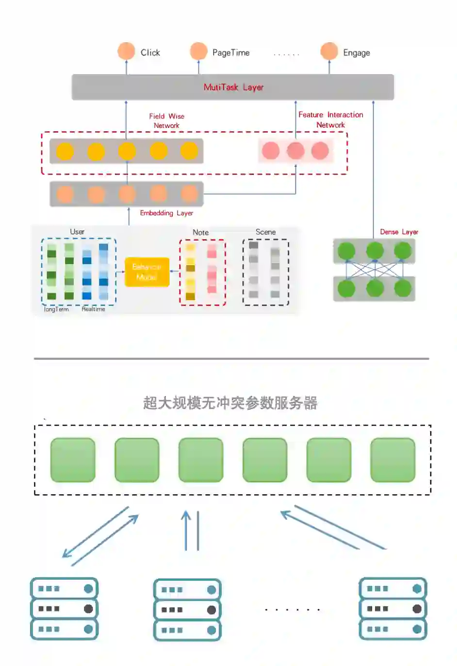 上图是推荐模型的架构。这是一个多任务的机器学习模型,它能够预估用户的点击、停留时长、是否点赞收藏等行为。针对小红书平台产生的海量的系数参数,小红书通过超大规模无冲突的参数服务器,对这些参数进行更新和捕捉。