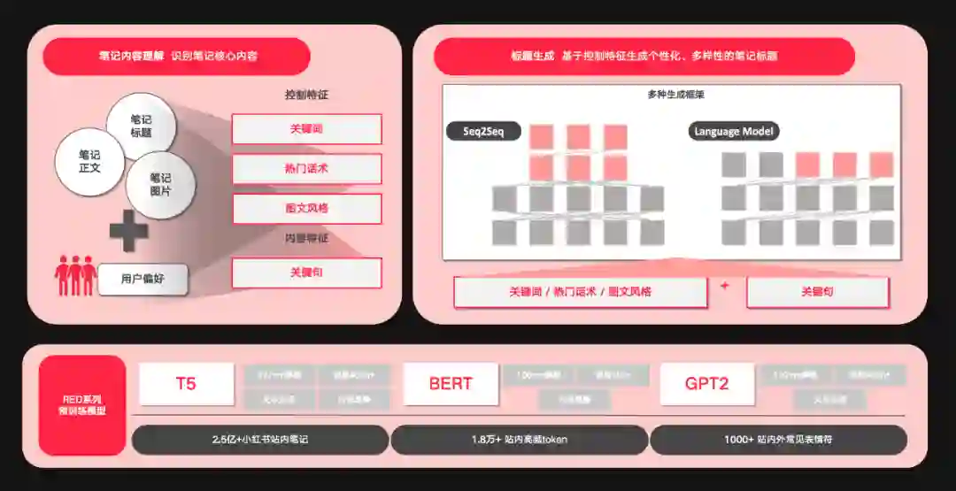 为此,小红书技术团队使用了基于大规模神经网络的生成式技术,来帮助商家根据内容去生成更好的标题和内容。这背后其实是基于大规模的预训练模型,包括业界较为领先的 T5、BERT、GPT 等模型架构,这些模型架构都在小红书海量的多模态数据上进行了训练。一部分的预训练模型用来去做笔记内容理解,一部分预训练模型会被用来去指导生成式模型去生成标题,这些都是相关技术在商业领域的应用方式。