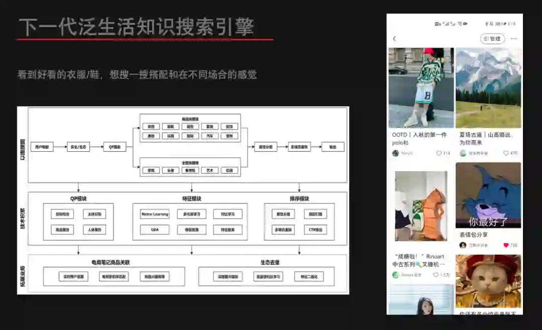 举例来说,比如某人在小红书上看到了一个看好的衣服和鞋,想搜一搜它的搭配有哪些,了解在不同场合下搭配这件衣服和这款鞋子是什么样的感觉,这属于生活知识的搜索,同时又是多模态的搜索。