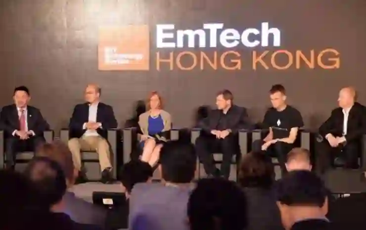 2016 Emtech香港峰会演讲嘉宾(从左至右):香港应用科技研究院(ASTRI)安全与数据科学系主任黄炳华;Asia-IO Advisors Limited 执行董事谢迪洋; 香港证券及期货事务监察委员会风险及策略负责人资深董事比妮诺蓝; 中国IBM研究部上海实验室负责人 Andreas Kind;以太坊基金会联合创始人 Vitalik Buterin 和 R3-CEV 市场调查总监 Tim Swanson