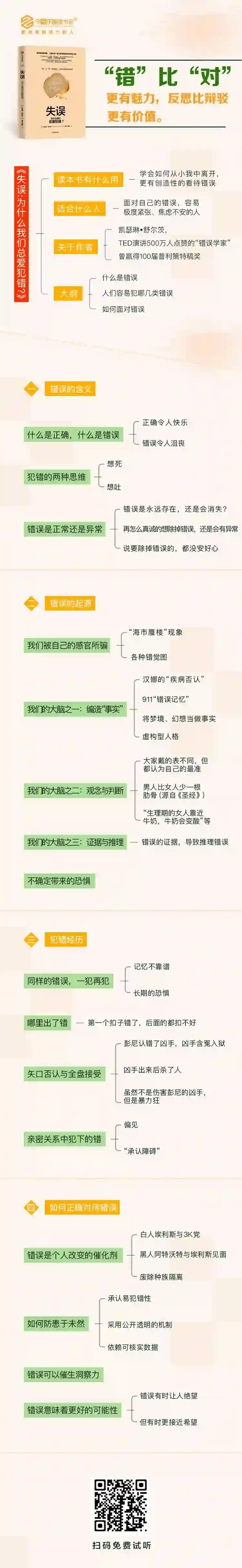 本杰明·富兰克林有一句至理名言:“错误是透视人类本性的一扇窗户,从中可以看到我们驰骋的想象、无限的潜能和不羁的灵魂”。《失误:为什么我们总爱犯错?》是专门讲失误和如何面对错误的。舒尔茨在书中告诉我们:人们其实讨厌的不是犯下的错误本身,他们讨厌的是意识到自己错了。科学应对错误,是维系社会关系的基础。它告诉我们,无论错误带给了我们怎样的迷惘、痛苦和打击,归根结底,它才是教我们读懂自己的良师。