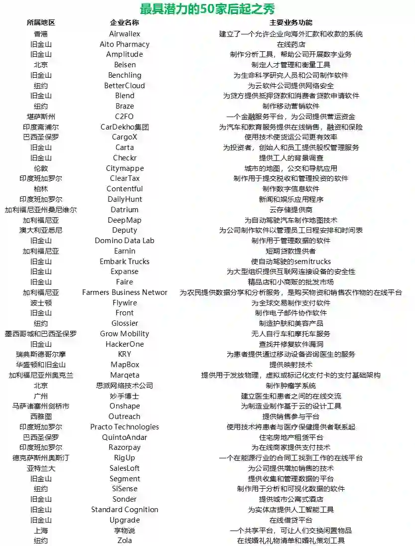 CB Insights使用各种数据,包括财务状况以及公司所服务的市场的实力和规模,来识别可能正在实现10亿美元估值的50家初创企业。