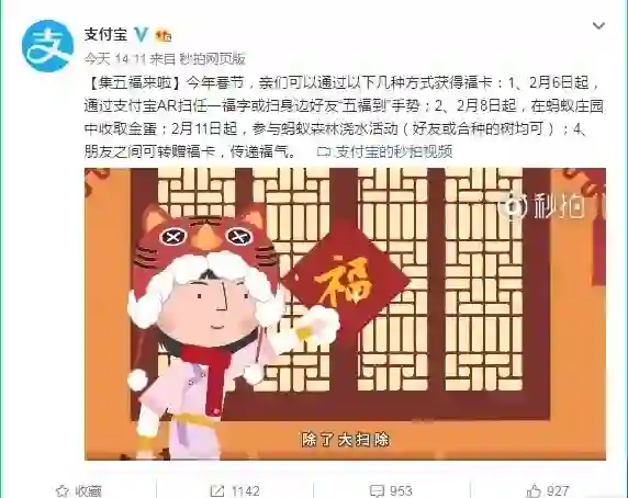 支付宝推春节“集五福”活动:四种方式可获得福卡