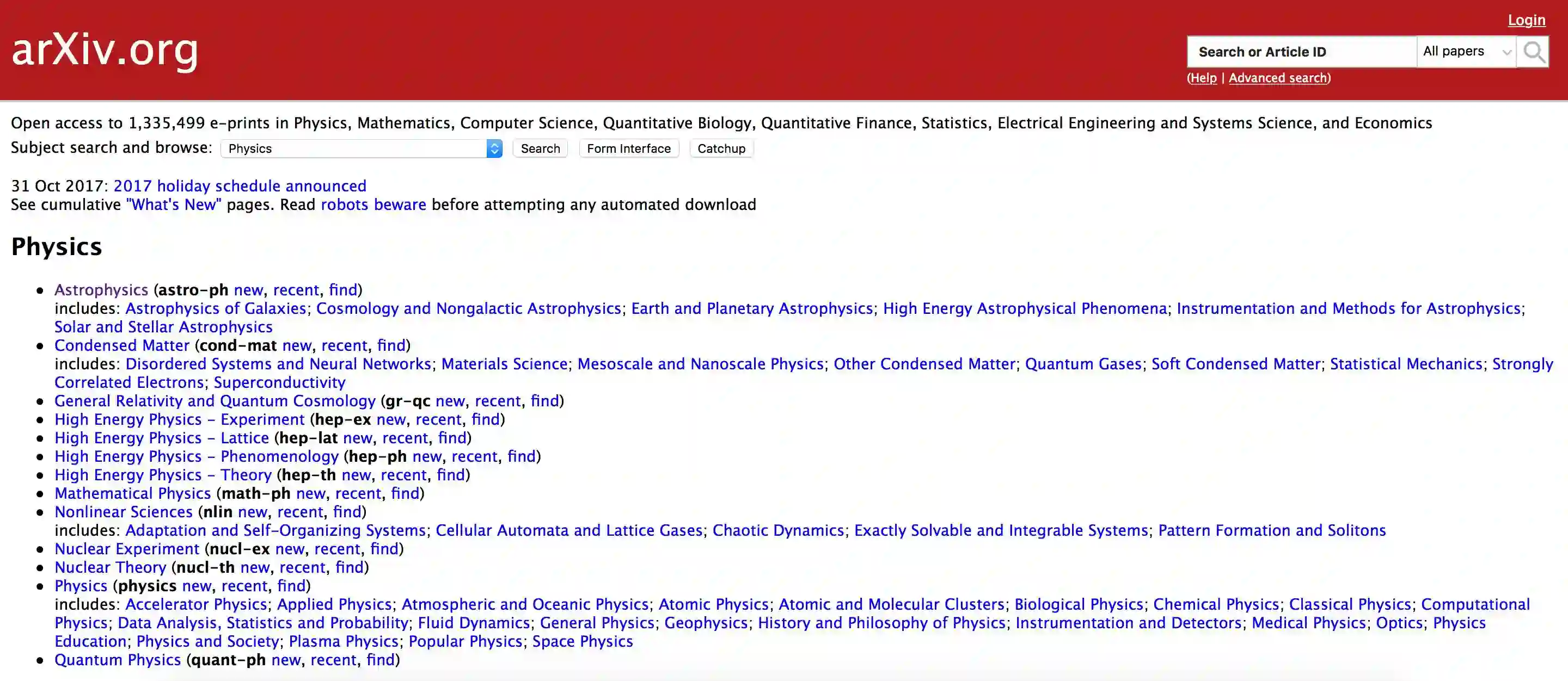 ArXiv是一个几乎每位科研工作者都熟悉的开放式的网站。科学家通过在arXiv发表论文的预印本,能迅速被别人访问阅读。自1991年起,arXiv 已经聚集了物理、数学、计算机科学、统计学、定量生物学和金融学等领域的一百多万篇论文。每个工作日几乎都会增加数百篇新的研究论文,包括从希格斯玻色子到量子隐形传态,再到恒星的形成等各个学科。