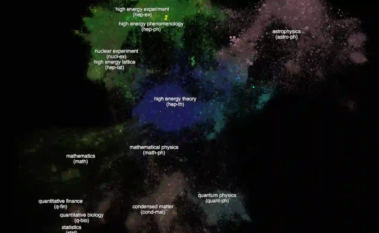 另一个有趣的点是色块之间的连接区域,也就能找到交叉学科论文的区域。例如,天体物理学(astro-ph)和理论高能物理学(hep-th)之间的联系有着暴胀和暗能量等课题的研究。这两个课题都需要天体物理学方面的技术,如宇宙微波背景的测量,配合以详细的理论计算,因此地图中显示出大量的色块重叠。
