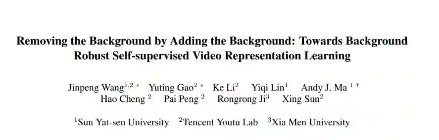自监督学习通过从数据本身来获取监督信号,在视频表征学习领域展现出了巨大潜力。由于一些主流的方法容易受到背景信息的欺骗和影响,为了减轻模型对背景信息的依赖,我们提出通过添加背景来去除背景影响。具体而言,给定一个视频,我们从中随机选择一个静态帧,并将其添加到其它的每一帧中,以构建一个分散注意力的视频样本,然后要求模型拉近 分散注意力的视频样本与原始视频样本之间的特征距离,如此使得模型能够更好地抵抗背景的影响,而更多地关注运动变化。我们的方法命名为背景消除(Background Erasing,BE)。值得注意的是,我们的方法可以便捷地添加到大多数SOTA方法中。BE在MoCo的基础上,对具有严重背景偏见的数据集UCF101和HMDB51,分别带来了16.4%和19.1%的提升,而对具有较小背景偏见的数据集Diving48数据集带来了14.5%的提升。