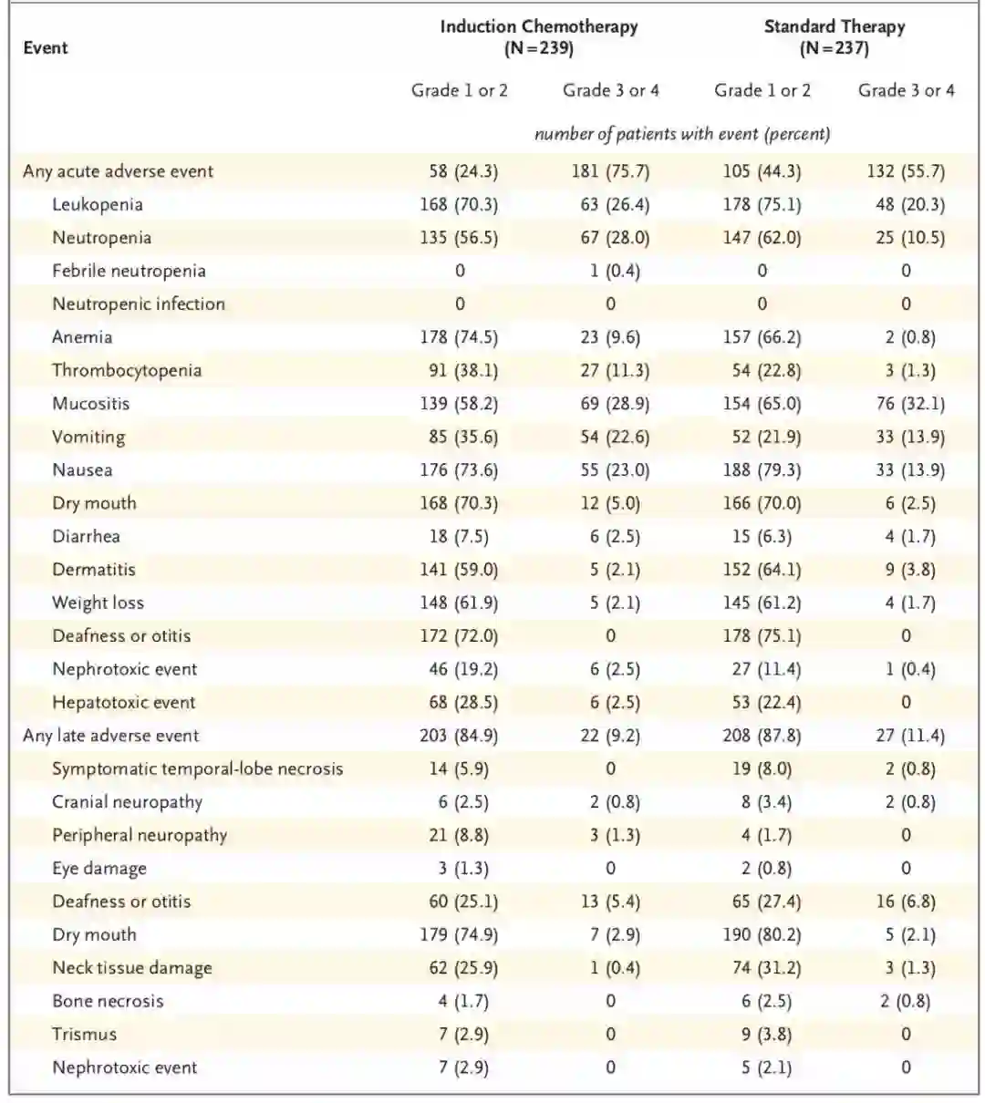 该项临床试验在全国12家中心一共招募了480例患者。研究的结果表明,在同步放化疗的基础上增加GP诱导化疗,结果可以将3年无瘤生存从76.5%提高到85.3%。同时总生存率也从90.3%提高到94.6%。并且GP诱导化疗方案相对安全,超过95%的病人可以顺利完成3疗程诱导化疗。虽然增加了一些急性毒性反应比如中性粒细胞下降、血小板下降,但是这些毒性反应在临床上比较容易处理,而且该方案也没有明显增加病人的远期毒性反应。