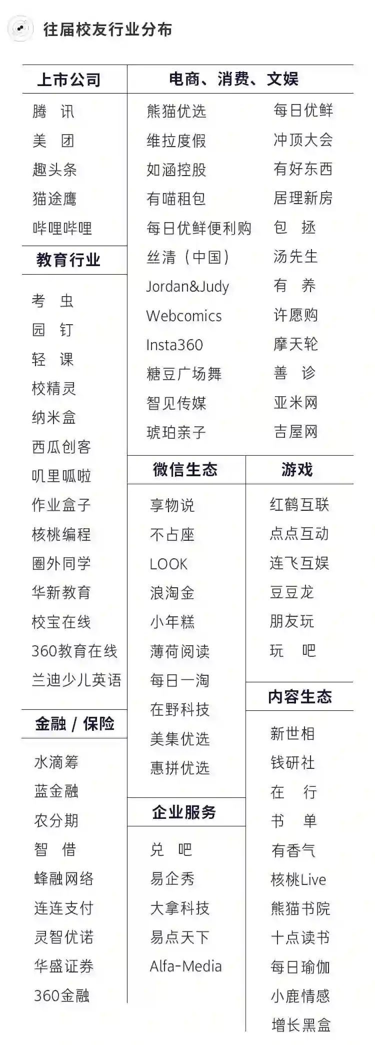 目前,「增长天团」已有 100 位校友,遍布教育、消费、内容生态、微信生态、金融、企业服务、游戏等领域,其中有很多非常低调的同学,但其实企业异常的成功,比如其中有位大家不太听过公司名称的同学,站起来问的第一个问题就是“我今年要负责帮公司花掉一两个亿的市场预算,想问下渠道的选择”...