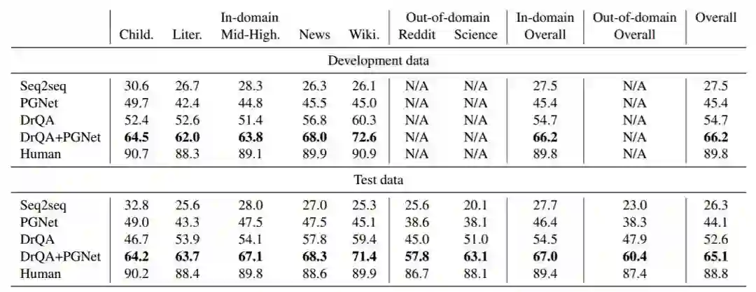 表 6 列出了模型在开发数据和测试数据上的结果。根据测试集上的结果,seq2seq 模型表现最差,有些答案不管有没有出现在段落中,都会频繁出现,这是一种众所周知的对话模型行为(Li et al., 2016)。PGNet 通过关注文章中的词汇来缓解反应频繁的问题,优于 seq2seq 17.8 个百分点。然而,它仍然落后于 DrQA 8.5 个百分点。原因可能是 PGNet 在回答问题之前必须记住整个段落,而 DrQA 避免了这项巨大开销。但 DrQA 在回复自由形式答案的问题时不理想(参见表 7 中的 Abstractive 行)。当 DrQA 被输入 PGNet 时,我们授权 DrQA 和 PGNet - DrQA 生成自由形式的答案; PGNet 专注于参照而不是段落。这种组合比经典 PGNet 和 DrQA 模型分别要强 21.0% 和 12.5%。