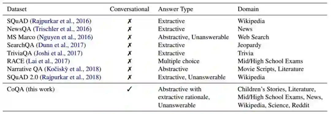 表 1:CoQA 与现有大型阅读理解数据集的比较(约 10 万多个问题)。