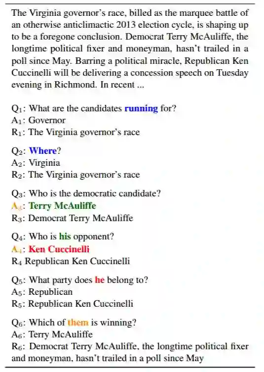 对于图 2 中的示例,对话从问题 Q1 开始。我们根据段落中的依据 R1 用 A1 回答 Q1。在这个例子中,回答者只写了 Governor 作为答案,但选择了很长的依据——「The Virginia governor’s race」。