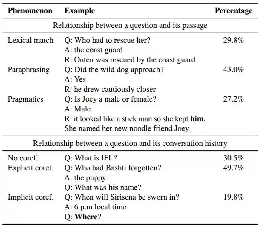 在这个例子中,我们观察到焦点实体(entity of focus)随着对话的进行而改变。提问者使用 his 指代 Q4 中的 Terry,he 指代 Q5 中的 Ken。如果这些问题得不到解决,我们最终将会得到错误答案。问题的对话性质要求我们根据多个句子(当前问题和之前的问题或答案,以及段落中的句子)来推理。通常,单个问题的参照可能会跨越多个句子(例如,图 1 中的 Q1,Q4 和 Q5)。我们在第 4 节中描述了其它问答类型。