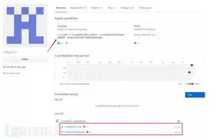 使用搜索引擎搜索nidaye222,可以发现,发布者在14天刚创建了个github账户,而在6月26号和30分别fork了漏洞扫描器kunpeng和开源挖矿xmrig,看来这个蠕虫的作者很有可能是从这得到了启发。