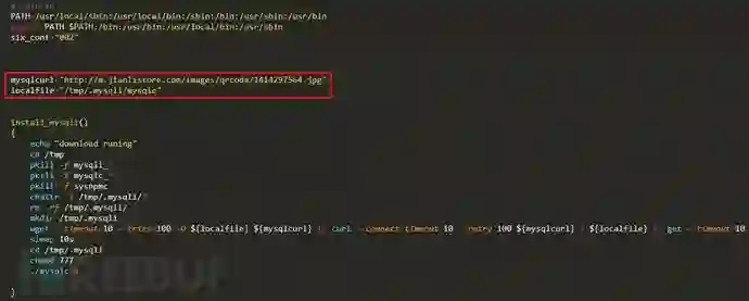 解密后可以看见其主要操作,将m.jianlistore.com/images/qrcode/1414297564.jpg保存为本地的/tmp/.mysqli/mysqlc并执行,这个文件之前已经有文章分析过了,不再累赘:https://www.freebuf.com/articles/terminal/206170.html。