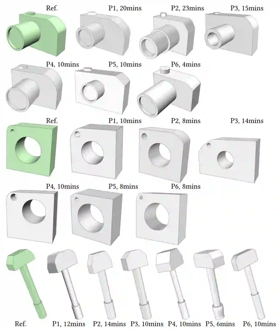 图10:无 CAD 建模经验的用户创造的模型和所用时间。绿色模型是参考目标,同时允许并鼓励用户自由探索形状的变化。