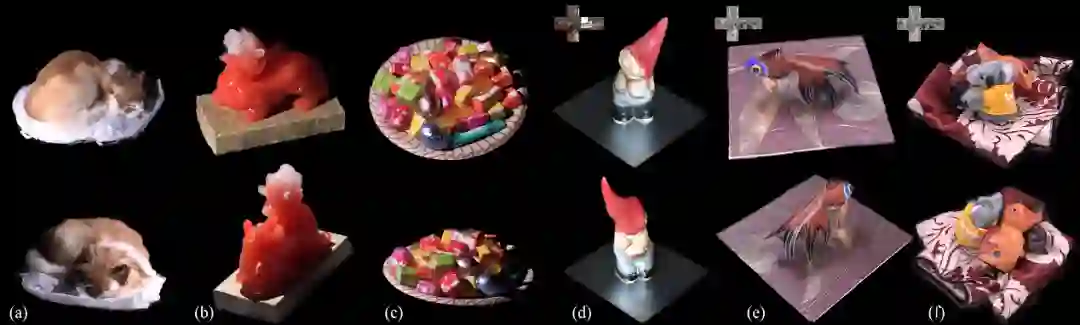 图5:更多的例子。其中(a)、 (b)、 (c)为点光源下的渲染结果,而(d)、(e)、(f)为环境光照下的渲染结果。